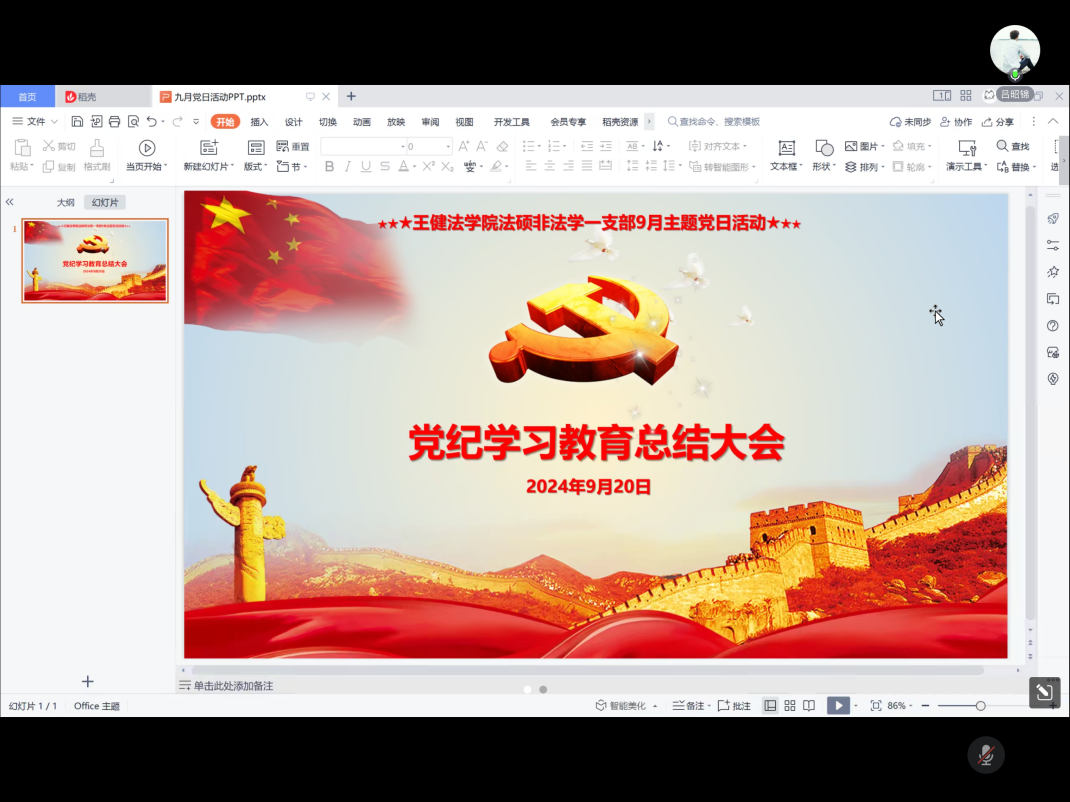 法硕非法学一支部组织全体党员开展党纪学习教育总结大会暨九月主题党日活动。受台风影响,本次活动以线上方式进行。